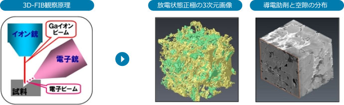 - FIB-SEMでは、数十μm³(CUBE)における活物質、導電助剤、空隙などの3次元分布を確認可能。